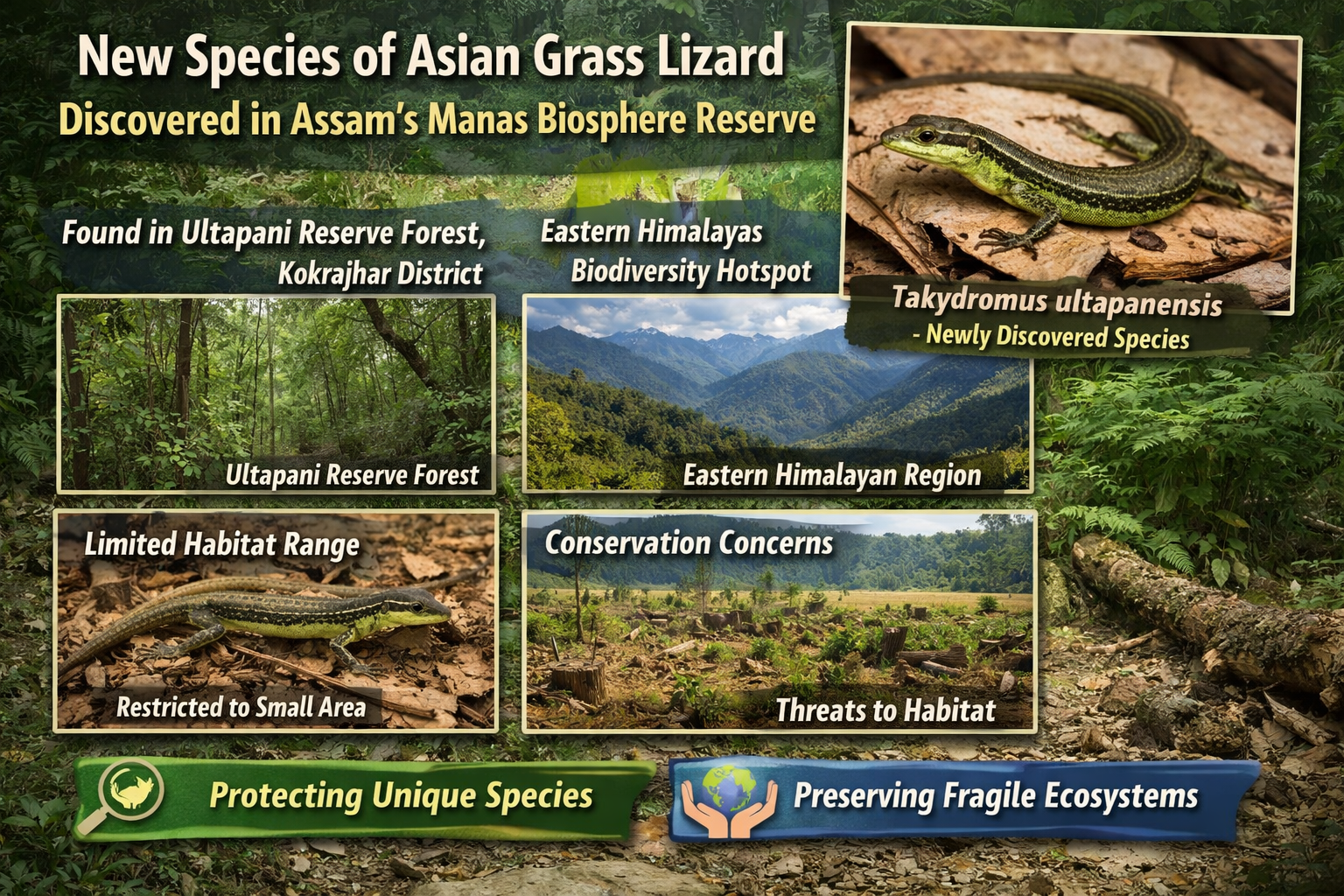 Scientists have discovered a new species of Asian grass lizard named Takydromus ultapanensis in the Manas Biosphere Reserve. The discovery was made during field surveys conducted in the forested landscapes of Assam’s western region, further highlighting the ecological significance of this protected area.